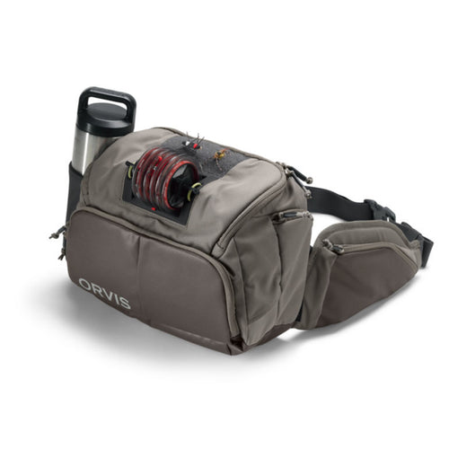 For those who love an unencumbered feel while fly fishing, whether a guide or hardcore angler, the Orvis Guide Hip Pack offers 9 liters of capacity and a highly innovative design to please any organizational perfectionist. The 100% recycled ECO CORDURA® Guide Hip Pack has the new Tippet Whippet recessed docking station with tippet bar included for instant, fixed, and fumble-free access for up to six spools. The large main compartment is topped with a large fly patch and inside are a zip pocket, drop-in pockets, and stretch mesh sorting pockets. Smaller front compartment with mesh pockets. The substantial side panels both have zip pockets and hidden net scabbards that store a net with instant access. A lo-pro zinger/nipper pass-through port and small zip pocket on one side and a water bottle holder on the other. Included are two straps, one lightweight neck strap and one heavier shoulder strap with multiple docking stations, a zip pocket, and fly patch. In sand. Weight 700g/1.54 lbs.
